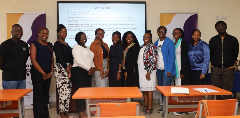 Following the opening remarks by Professor Charity Waithima, Chair of the Department of Psychology in the School of Humanities and Social Sciences, the training commenced, facilitated by Dr. Nazarene Kiwinga from the Department of Psychology and Marvin Njuguna from GVRC. The session emphasized trauma-informed care principles, psychological first aid, gender responsiveness, and survivor-centered crisis response. Volunteers learned to recognize trauma responses, communicate safely and empathetically, navigate referral pathways, and maintain professional boundaries while managing difficult calls. Strategies for volunteer wellbeing and prevention of secondary trauma were also included.